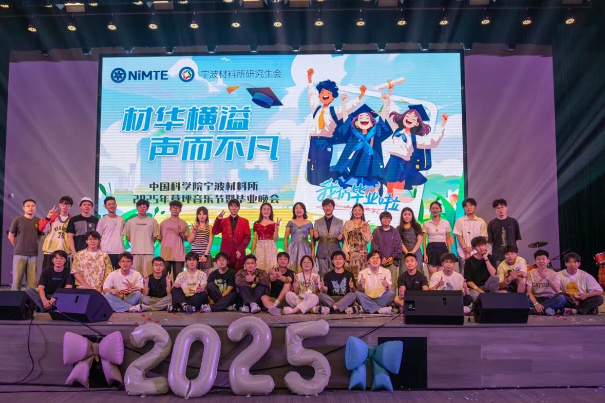 6月6日晚,中国科学院宁波材料技术与工程研究所研究生会举办的2025年“材华横溢·声而不凡”草坪音乐节暨毕业晚会在材料工程学院阅微楼三楼报告厅成功举办。晚会由段佳旻、李欣宇、刘新锐、谢佳豪四位主持人主持,共分为流光拾忆、春风作序、踏歌而行三个篇章。夏日明信片乐队(赵浩宇、郑科宇、逯兴进、崔隽、明庆)用《想去海边》掀起开场风暴!吉他声如海浪拍岸,鼓点似浪花飞溅,瞬间点燃了全场观众的热情。
