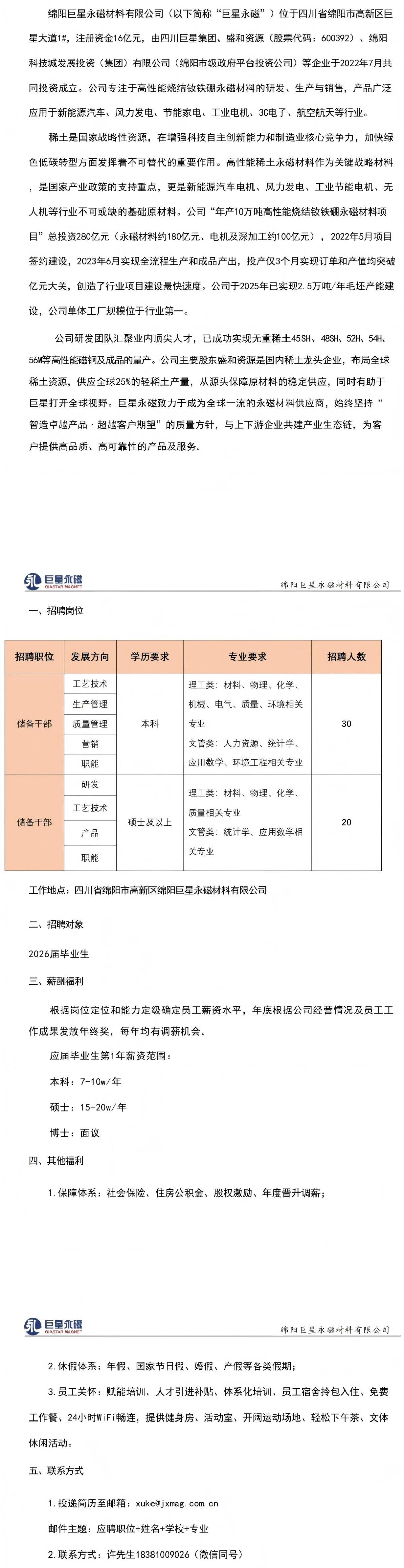 宣讲会||绵阳巨星永磁材料有限公司(11月3日上午10:00,阅微楼513)