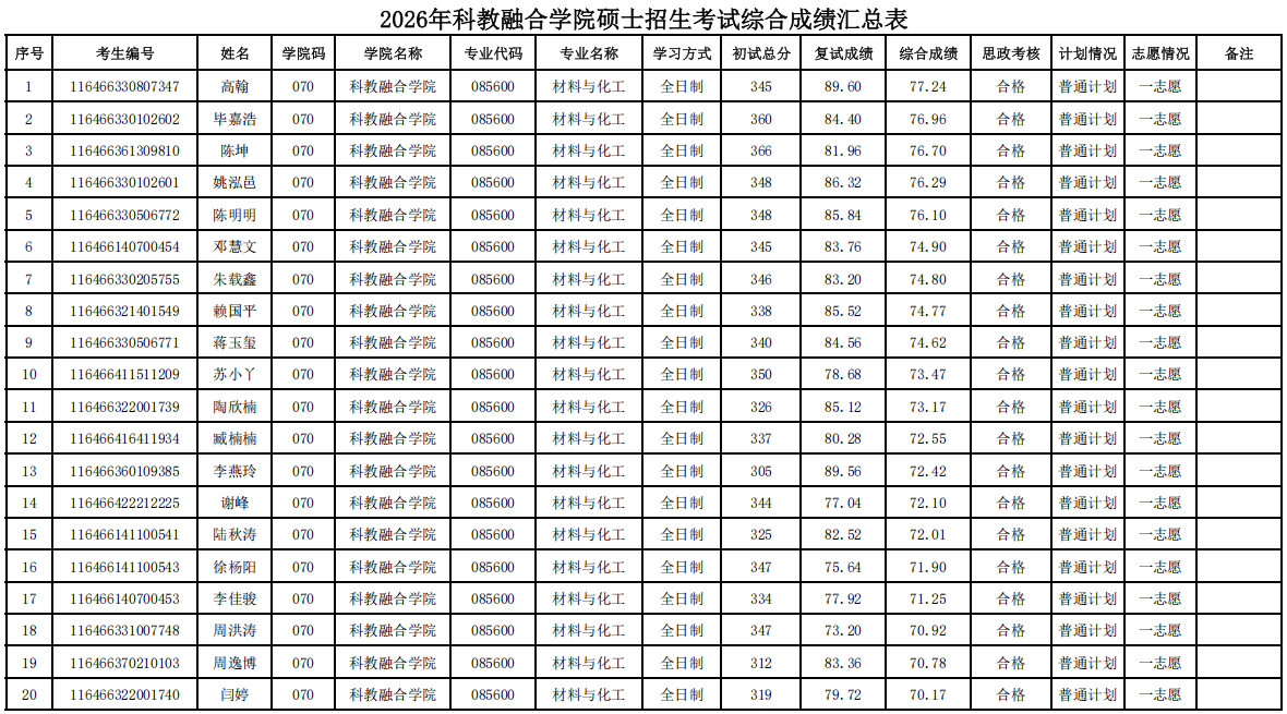 2026年宁波大学科教融合学院硕士招生考试综合成绩公布(一志愿)